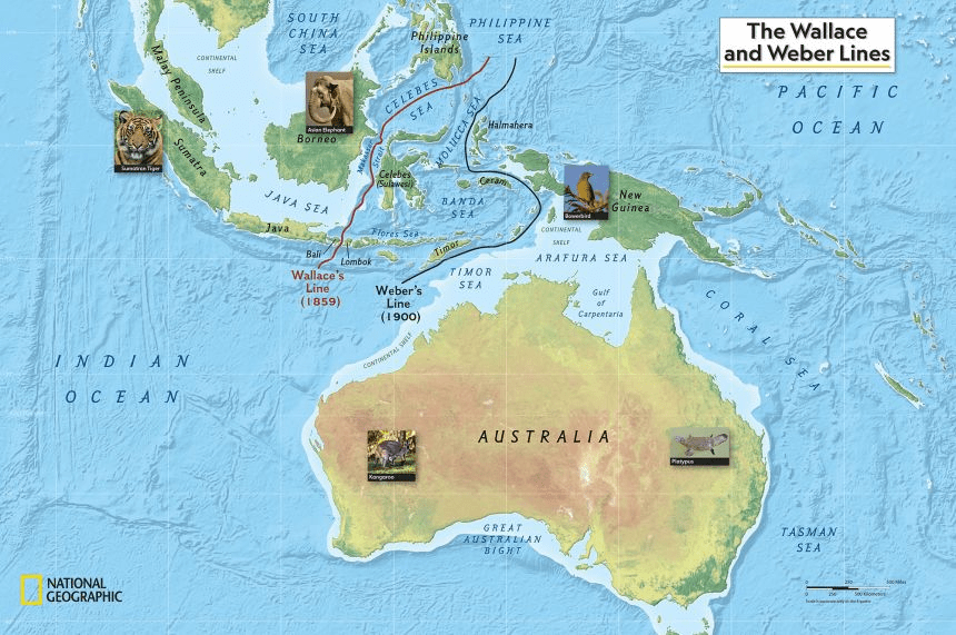 Max Wilhelm Carl Weber as leader of the Siboga Expedition led him to propose Weber’s line, which encloses the region in which the mammalian fauna is exclusively Australasian, as an alternative to Wallace’s Line. As is the case with plant species, faunal surveys revealed that for most vertebrate groups Wallace’s line was not the most significant biogeographic boundary. The Tanimbar Island group, and not the boundary between Bali and Lombok, appears to be the major interface between the Oriental and Australasian regions for mammals and other terrestrial vertebrate groups. (source)